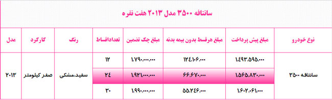 به گزارش باشگاه خبرنگاران، فروش اقساطی سانتافه ۳۵۰۰ مدل ۲۰۱۳ هفت نفره در دو رنگ سفید و مشکی از سوی لیزینگ ملت آغاز شد.