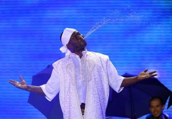 همچنین این مرد غنایی هر زمان که اراده کند قادر است تا آب خورده شده را از دهان خود بازگردانده و همانند یک فواره آب عمل کند.