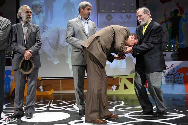 عبدالحسین مختاباد، عضو شورای شهر تهران، در مراسم اختتامینه جشنواره تئاتر شهر بر دستان علی نصیریان بوسه زد.