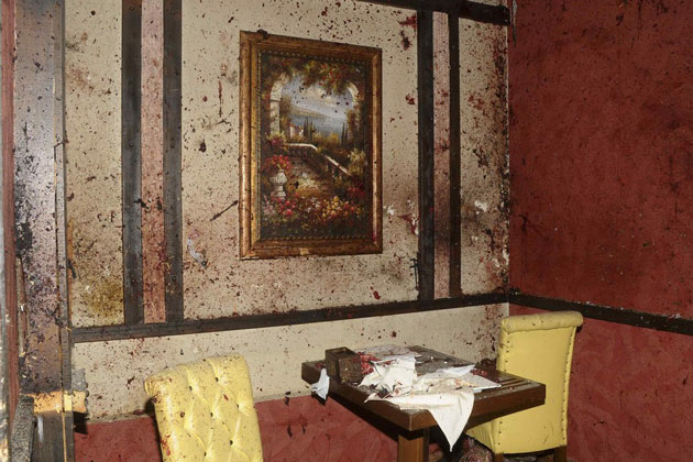 آثار خون قربانیان انفجار بر دیوار این رستوران قابل مشاهده است.
