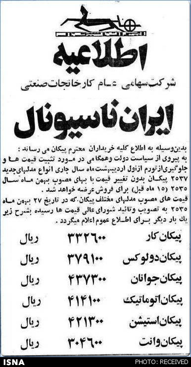 قیمت انواع پیکان + اطلاعیه ایران ناسیونال