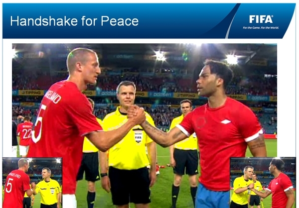 به گزارش فارس به نقل از سایت فدراسیون جهانی فوتبال، فیفا در نامهای به کشورهای عضو اعلام کرد: ما میخواهیم به اطلاع شما برسانیم که فیفا به تازگی یک همکاری رسمی با مرکز صلح نوبل طی کنگره 2012 فیفا انجام داده است. به عنوان بخشی از این مشارکت جدید، فیفا موافقت کرده است تا یک پروتکل شناخته شده با عنوان "دست دادن برای صلح" در تمام مسابقات FIFA انجام شود.
