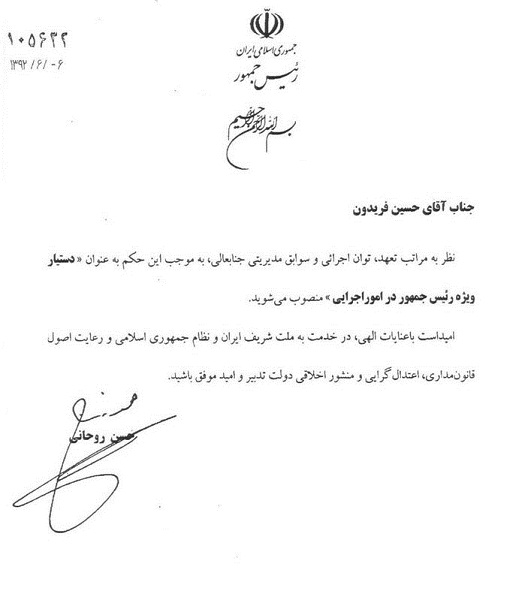 انتخاب - تصویر زیر، حکم حسن روحانی برای برادرش حسین فریدون را نشان می‌دهد.