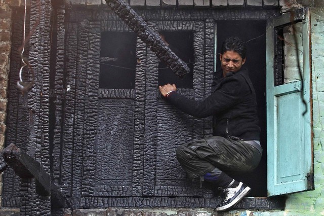 تلاش یک مرد جوان در سرینگر کشمیر برای باز کردن پنجره یک خانه آتش گرفته و نجات 4 نفر از خانه