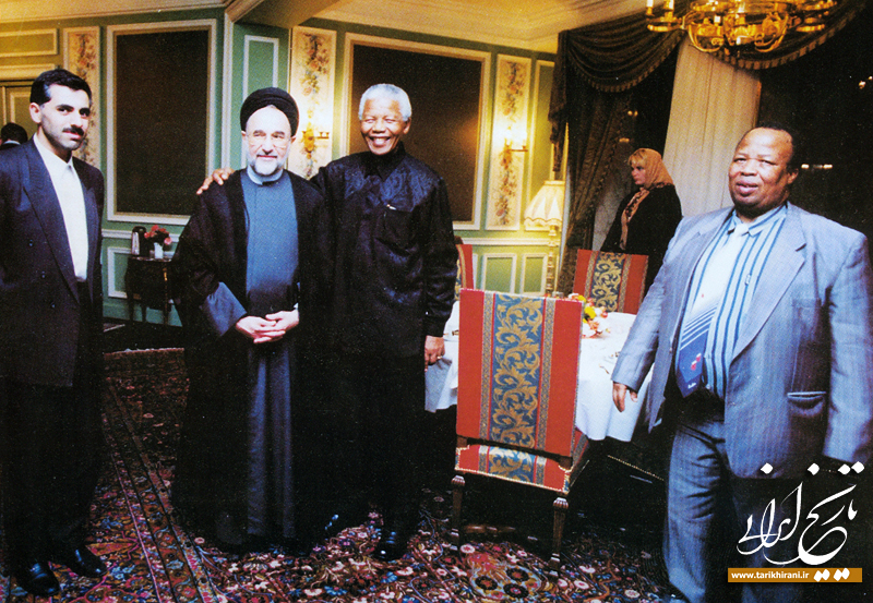 تاریخ ایرانی - نلسون ماندلا رهبر جنبش ضدنژادپرستی آفریقای جنوبی مهرماه ۱۳۷۸ به ایران آمد و با مقامات کشورمان به گفت‌وگو پرداخت. این تصویر وی را در کنار سیدمحمد خاتمی رییس‌جمهوری وقت ایران نشان می‌دهد. نلسون ماندلا در این دیدار گفت: «رییس‌جمهور خاتمی من به شما علاقه‌مندم و می‌خواهم به خاطر سیاست رو به پیشرفتی که جمهوری اسلامی ایران داشته است تبریک بگویم.»