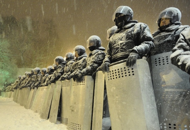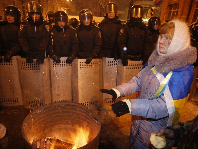 یکی از معترضان دولت در اوکراین در حال گرم شدن با آتش در مقابل پلیس