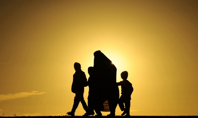 یک خانواده افغان در حال گذر از خیابان در غروب شهر هرات