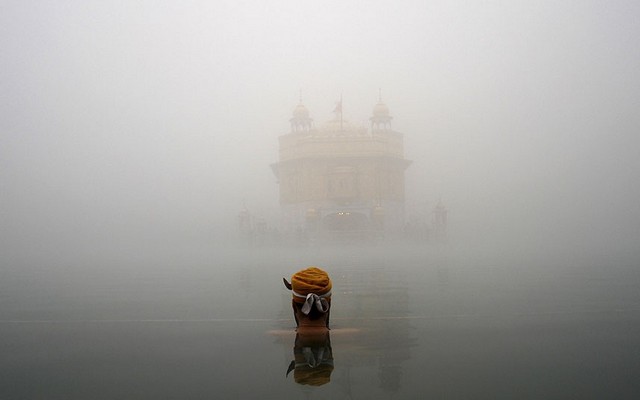 یک سیک هندی در حال انجام آیین حمام مقدس در رودخانه مقابل معبد طلایی در آمریتسار