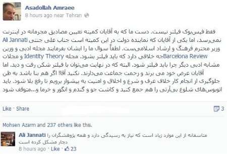 به گزارش ایرنا،اسدالله امرایی یکی از مترجمان برجسته کشور امروز شنبه با طرح پرسشی در صفحه فیس بوک خود از وزیر فرهنگ و ارشاد اسلامی سوال کرد که چرا باید صفحات مجلات ادبی مانند بارسلونا ری ویو و تئوری آیدنتیتی فیلتر باشد .
