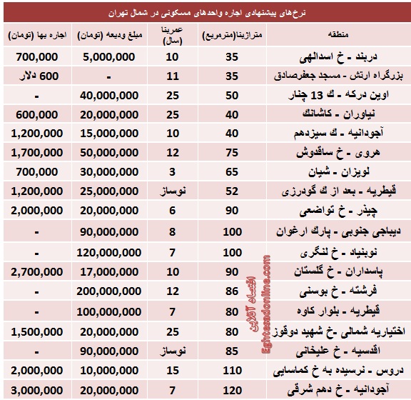مظنه رهن و اجاره در شمال تهران چند؟ (+جدول)