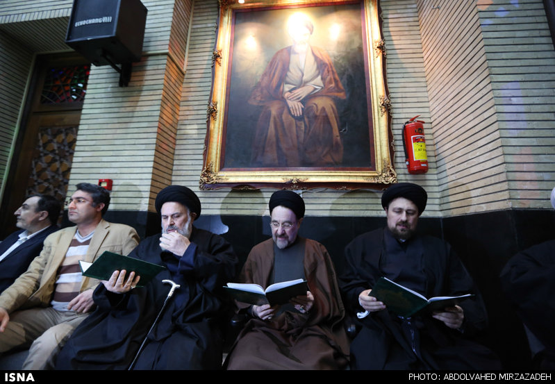 سیدمحمد خاتمی رئیس جمهور پیشین و سیدحسن خمینی در مراسم هفتم درگذشت مادر محمدجواد ظریف وزیر امور خارجه درمسجد نور تهران