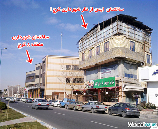به گزارش معماری نیوز، این ساختمان نا ایمن کمتر از ۵۰ متر با ساختمان مرکزی شهرداری منطقه ۸ کرج فاصله دارد. از تصویر نصب پرده در داخل واحدها و همچنین فعالیت "بازار میوه و تره بار" مشخص است که این ساختمان در حال استفاده و سکونت است.