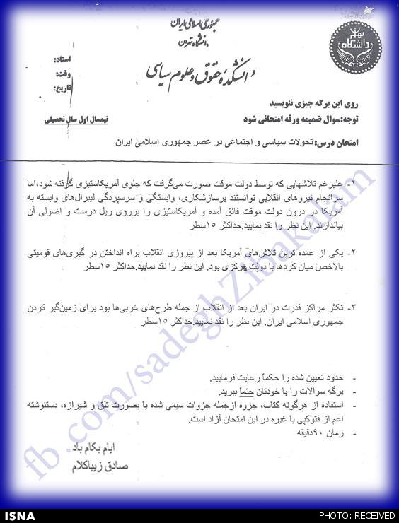 تصویر زیر، سوالات طرحشده توسط صادق زیباکلام برای امتحان آخر ترم دانشجویانش در دانشگاه تهران را نشان میدهد.