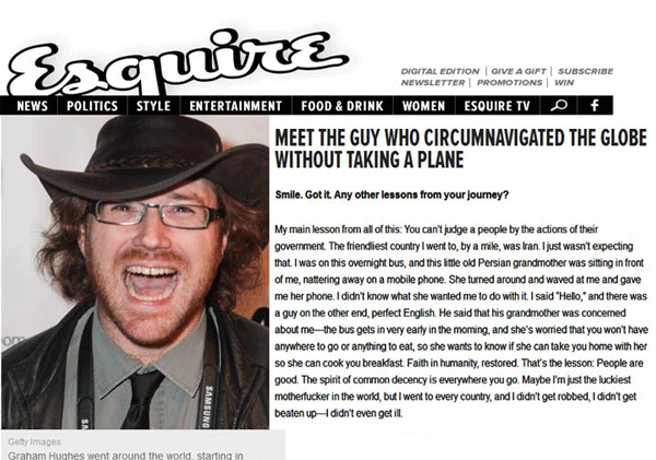 "گراهام  دیوید هیوز" جهانگرد و فیلمساز 34 ساله بریتانیایی که از سال 2009 رکورد سفر بدون هواپیما به 201 کشور جهان را دارد، ایران را جزء یکی از 10 کشور برگزیده خود و دوست داشتنی ترین کشوری خواند که تا کنون از آن دیدار کرده است.