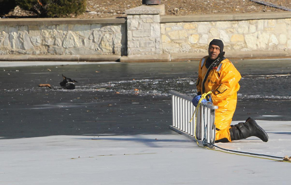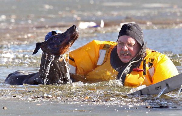 به گزارش فرارو، این سگ بر روی سطح یخ زده دریاچه یک غاز را تعقیب می کرد که ناگهان با شکستن یخ ها به داخل آب افتاد. ماموران آتش نشانی دقایقی بعد با تماس صاحب این سگ در محل حاضر شدند و توانستند این حیوان را از مرگ حتمی نجات دهند. عکس های اسوشیتدپرس در همین رابطه را در زیر می بینید.