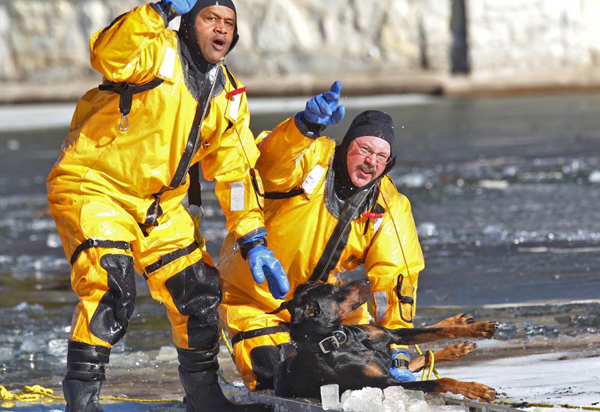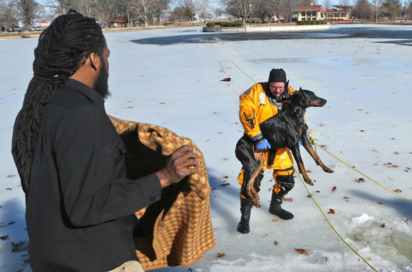 سگی که در دریاچه یخ زده سن لوئیس افتاده بود با کمک ماموران آتش نشانی محلی نجات پیدا کرد.