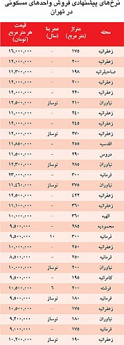 یک واحد مسکونی به متراژ 200 متر و 100 متر تراس و 2 پارکینگ به همراه 34 متر انباری در خیابان زعفرانیه 2 میلیارد و 400 میلیون تومان (12 میلیون تومان قیمت هر متر مربع) قیمتگذاری شده است. از سوی دیگر متری 12 میلیون تومان قیمت هر متر مربع واحدی 200 متری با 3 مستر و سالن ورزش و شنای فعال در فرعی درجه یک زعفرانیه، تعیین شده است.