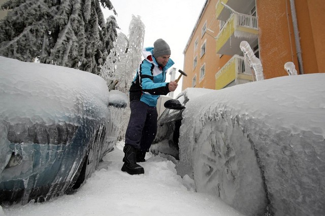 شدت برودت هوا سبب یخ زدگی برف های روی خودرو ها شده است (شهر پوستوجینا در اسلونی)