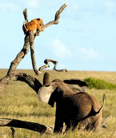 فرار شیر از خشم فیل به بالای درخت (تانزانیا)