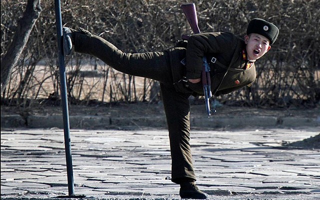 یک سرباز ارتش کره شمالی در حال نمایش ورزیدگی جسمی خود
