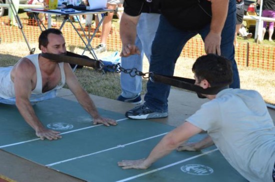 در این مسابقه عجیب شرکت کنندگان دو به دو مقابل یکدیگر قرار گرفته و سعی می کنند تا با طنابی که به دور گردنشان آویزان است طرف مقابل را تا خط معلومی کشیده و برنده رقابت شوند.