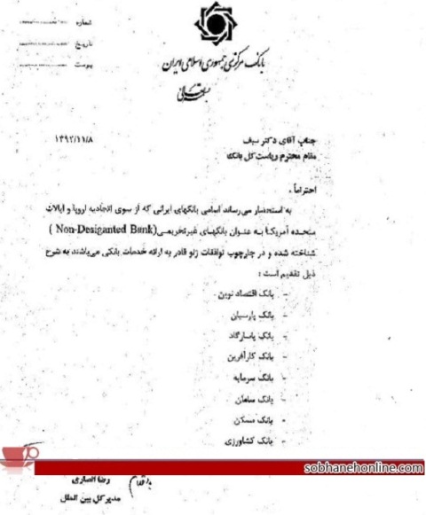 طبق نامه ای که رضا انصاری مدیرکل امور بین الملل بانک مرکزی خطاب به دکتر سیف ریاست این بانک ارسال کرده است، اسامی بانکهای ایرانی که از سوی اتحادیه اروپا و ایالات متحده به عنوان بانکهای غیر تحریمی (Non – Desiganted Bank) شناخته شده و در چارچوب توافقات ژنو قادر به ارائه خدمات بانکی هستند شامل بانکهای "اقتصاد نوین، پارسیان، پاسارگاد، کارآفرین، سرمایه، سامان، مسکن و کشاورزی" است.