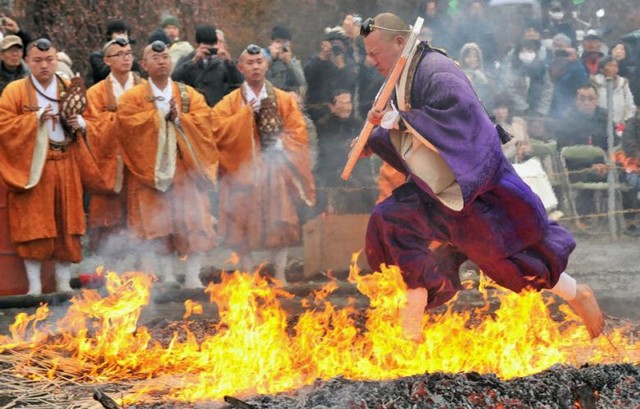 عبور از آتش با پای برهنه در جشنواره ای در شهر ناگاتورو در ژاپن