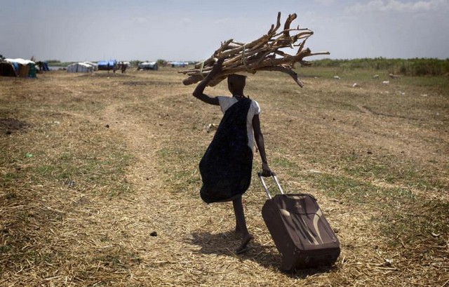 زنی در حال جابجایی چوب در اردوگاه ماکیشیو - سودان جنوبی