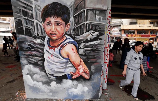 تابلویی در منطقه ضاحیه بیروت در نکوهش انفجارهای تروریستی
