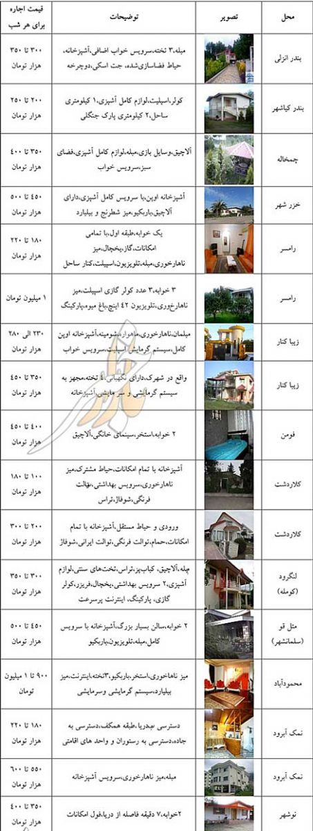 در ادامه، جدولی از نرخ اجاره‌ ویلا در هر یک از مناطق مختلف شمال کشور تهیه کرده است تا برای کسانی که قصد سفر به این شهر را دارند حداقل قیمت را ارائه کند.