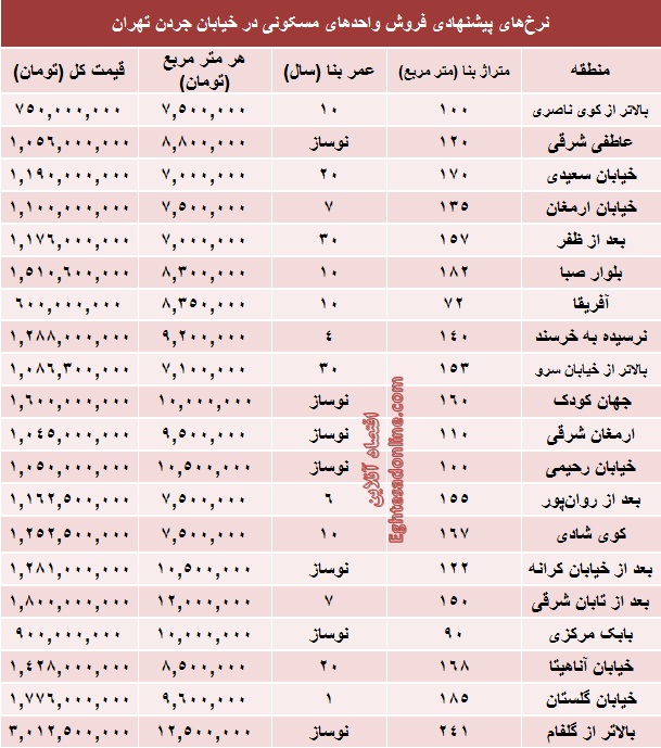 گرانقیمت ترین مسکن در منطقه جردن تهران بیش از 3 میلیارد تومان است.به گزارش اقتصاد آنلاین، آنچه در زیر می آید جدول نرخ روز انواع آپارتمان در محله های مختلف منطقه جردن (خیابان آفریقا) در شهر تهران به شرح زیر است.