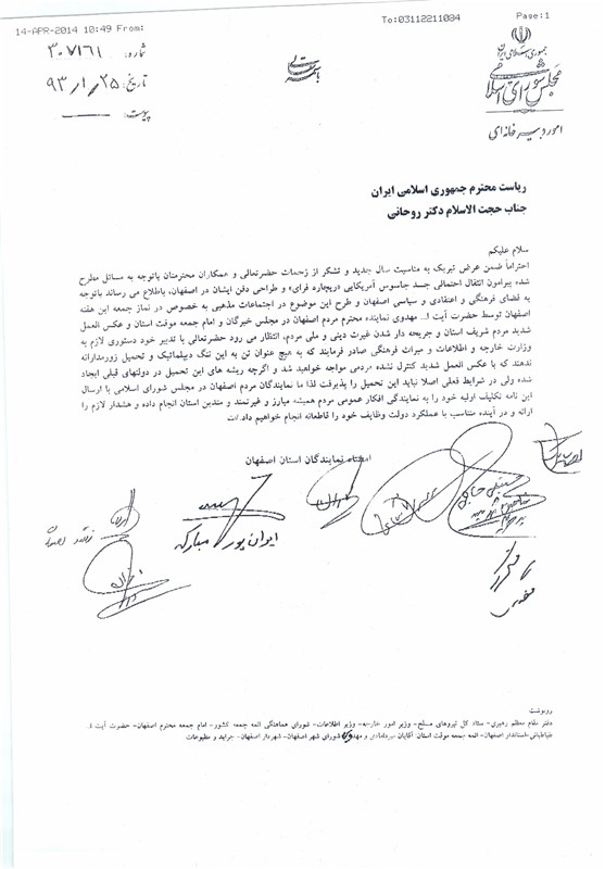 در بخش دیگری از این نامه تصریح شده است: اگرچه ریشههای این تحمیل در دولتهای قبلی ایجاد شده ولی در شرایط فعلی اصلاً نباید این تحمیل را پذیرفت لذا ما نمایندگان مردم اصفهان در مجلس شورای اسلامی با ارسال این نامه تکلیف اولیه خود را بهنمایندگی افکار عمومی مردم همیشه مبارز و غیرتمند و متدین استان انجام داده و هشدار لازم را ارائه و در آینده متناسب با عملکرد دولت وظایف خود را قاطعانه انجام خواهیم داد.