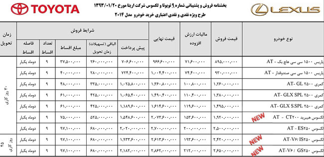 فروش ویژه خودروهای تویوتا 2014 (+جدول)