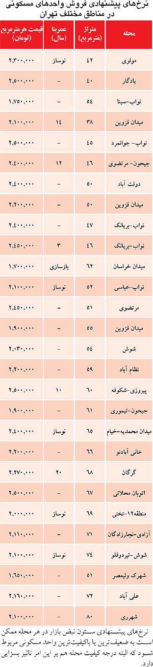 بررسی‌های «دنیای اقتصاد» در رابطه با این دسته از واحدهای مسکونی که از قیمت‌های این چنینی برخوردار هستند، نشان می‌دهد که واحدهای مسکونی با ارزش متری کمتر از 2 میلیون و 500 هزار تومان در اکثر مناطق تهران عرضه نمی‌شود و متقاضیان واحدهای مسکونی با قیمت مذکور می‌توانند در محله‌های جنوب و به ندرت در غرب و شرق تهران به جست‌وجو بپردازند.