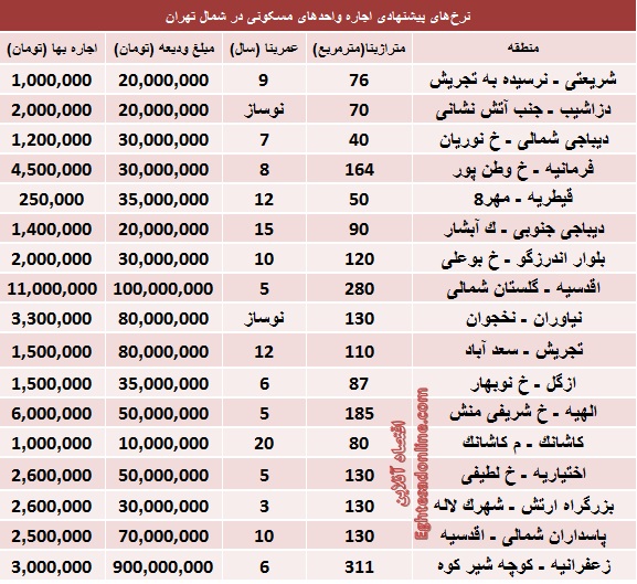قیمت جدید رهن و اجاره انواع واحدهای مسکونی در متراژ و سن ساخت متفاوت در مناطق شمالی تهران به شرح جدول زیر است؛