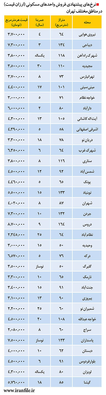 3 میلیون و700 هزار تومان قیمت هر متر مربع از یک واحد مسکونی 30 سال ساخت به متراژ 165 متر مربع در نظر گرفته شده است. این واحد مسکونی در محدوده بزرگراه رسالت واقع شده است و طبق گفته مشاوران املاک ارزش حقیقی هر متر مربع چنين واحدی بین 3 میلیون و 900 هزار تومان تا 4 میلیون و 240 هزار تومان است.