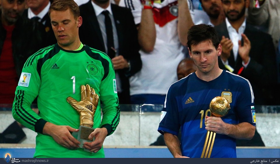 عصرایران - در پایان جام جهانی 2014 برزیل، لیونل مسی آرژانتینی به عنوان برترین بازیکن و مانوئل نویر دروازه‌بان تیم ملی آلمان به عنوان بهترین دروازه بان جام انتخاب شدند و به ترتیب توپ طلا و دستکش طلایی را از آن خود کردند.