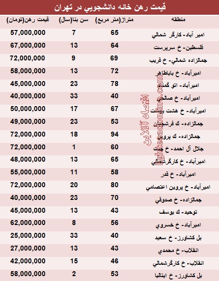 مظنه اجاره خانه‌های دانشجویی تهران (جدول)