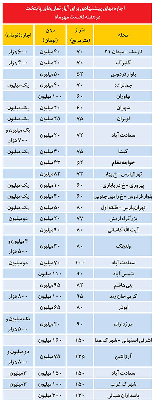 براساس مشاهده‌های میدانی «دنیای اقتصاد» آپارتمانی 90متری در محله مرزداران با 15 سال عمر، 27 میلیون رهن و اجاره بهای یک میلیون و 600 هزار تومان برای اجاره گذاشته شده است. همچنین آپارتمانی 50 متری در سید خندان  خیابان دبستان یک خوابه، 62 میلیون تومان رهن داده می‌شود و در زعفرانیه برای آپارتمانی با همین متراژ و نوساز با 30 میلیون تومان رهن و 3 میلیون تومان اجاره ماهانه، تعیین شده است.