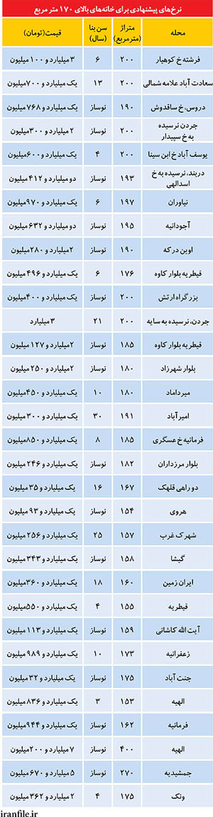 به‌طور مثال آپارتمانی نوساز در محله الهیه با 400 متر مربع مساحت، 7 میلیارد و 200 میلیون تومان برای فروش گذاشته شده است یا در محله جمشیدیه آپارتمانی 270متری، 5 میلیارد تومان برای فروش پيشنهاد شده است.