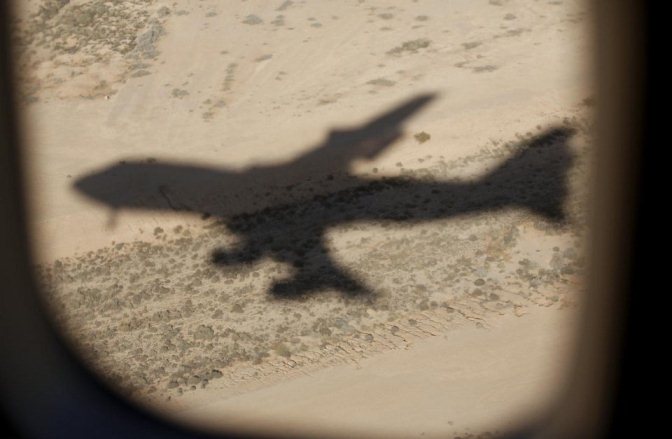 عصرایران - این تصویر در رسانه های خارجی از سایه پرواز هواپیمای حامل رئیس جمهور آمریکا بر روی صحرای عربستان سعودی منتشر شده است.