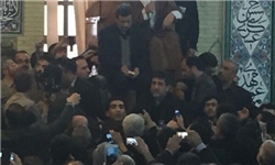 خودروی احمدینژاد در حیاط مسجد پارک شده بود و هنگام خروج در زیر برف و باران در بین ازدحام جماعت گیر افتاد که با کمک محافظان و نیروی انتظامی به زحمت باز شد.