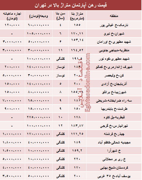 قیمت رهن آپارتمان‌های بزرگ در تهران (جدول)