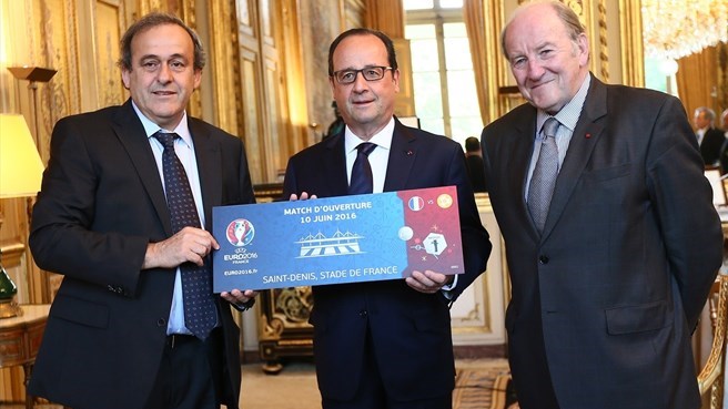 میشل پلاتینی، رئیس فدراسیون فوتبال اروپا (یوفا) در دیدار با فرانسوا اولاند، رئیس جمهوری فرانسه در کاخ الیزه از بلیت بازیهای جام ملت های اروپا در سال ۲۰۱۶ که فرانسه میزبان آن است، رونمایی کرد.