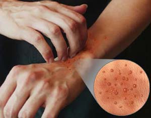 وی خاطرنشان می کند: قسمت های گرفتار پوست خارش شدیدی داشته، بطوریکه شیرخوار حسب توانایی خود با مالش و خراشیدن با ناخن به مقابله با خارش می رود. در این حالت پوست ملتهب شده و ممکن است ترشح دار شود.