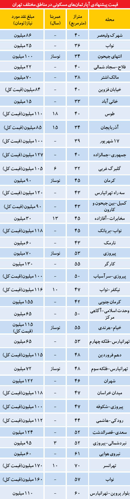 در محدوده خیابان 17 شهریور نیز ملکی 39 متری مجموعا 100 میلیون تومان قیمت گذاری شده است. در منطقه پیروزی نیز ملکی 52 متری که سه سال از عمر آن میگذرد با شرایط زیر برای فروش گذاشته شده است: 95 میلیون تومان نقد، 45 میلیون وام و 42 میلیون تومان پول ودیعه.جدول زیر به معرفی تعدادی از آپارتمانهای مسکونی در مناطق مختلف شهر تهران اختصاص دارد که نقدینگی مورد نیاز آنها کمتر از 100 میلیون تومان است و بقیه قیمت کل خرید خانه از طریق وام و رهن امکانپذیر است و قیمت کل فقط برای آپارتمانهایی ذکر شده است که نقدینگی موردنیاز آنها بیش از 100 میلیون تومان پیشنهاد شده است: