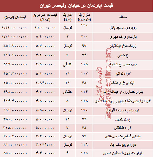 قیمت آپارتمان در خیابان ولیعصر تهران (جدول)