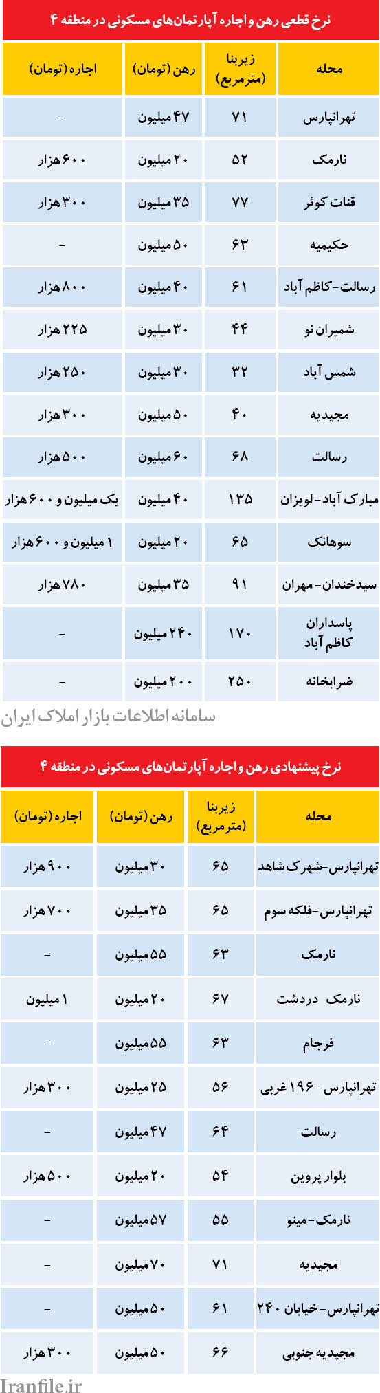 نرخ رهن و اجاره در منطقه 4 تهران (جدول)