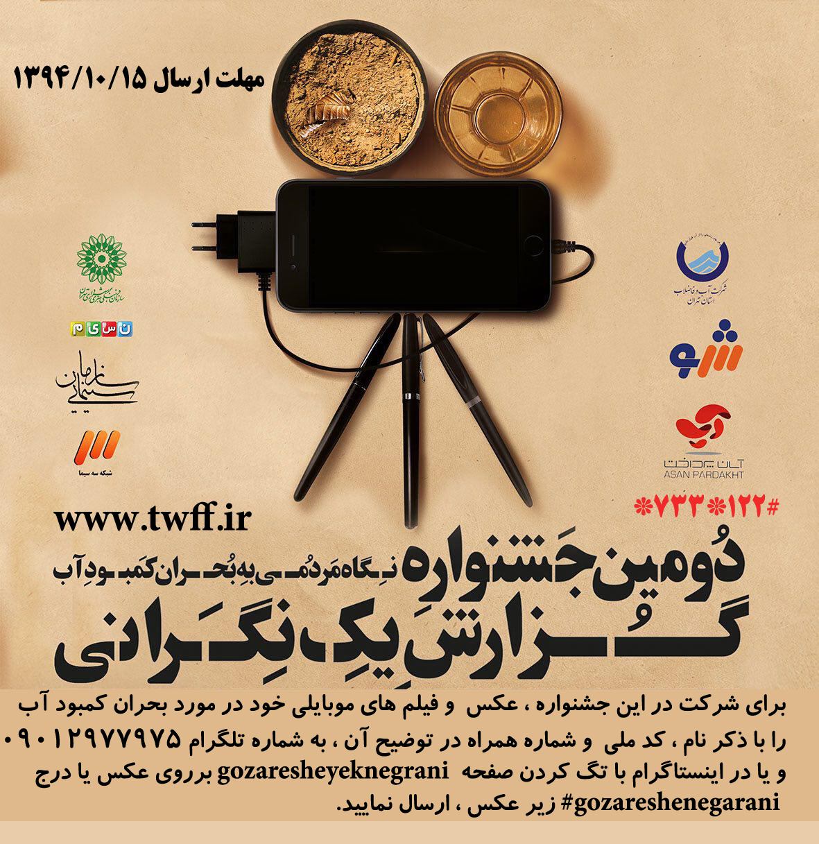 به گزارش عصرایران از ستاد خبری این حشنواره، بر اساس فراخوانی که از سوی دبیرخانه جشنواره منتشر شده، این دوره جشنواره با شعار «نگاه مردمی به بحران کمبود آب» و در قالب فیلم و عکس موبایل برگزار خواهد شد و آخرین مهلت ارسال آثار به جشنواره 15 دی ماه در نظر گرفته شده است.