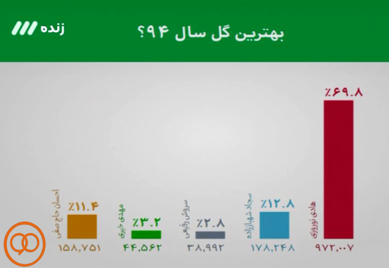 عصرایران - نزدیک به یک میلیون نفر دوشنبه شب به برنامه نود پیامک دادند تا گل هادی نوروزی را به عنوان بهترین گل سال انتخاب کنند. فردوسی پور سوال آخرین نود کلاسیک 1394 را بهترین کل سال گذاشته و پنجمین گل هم گل هادی نوروزی بود. گلی که با 70 درصد آرا به عنوان بهترین گل سال انتخاب شد.